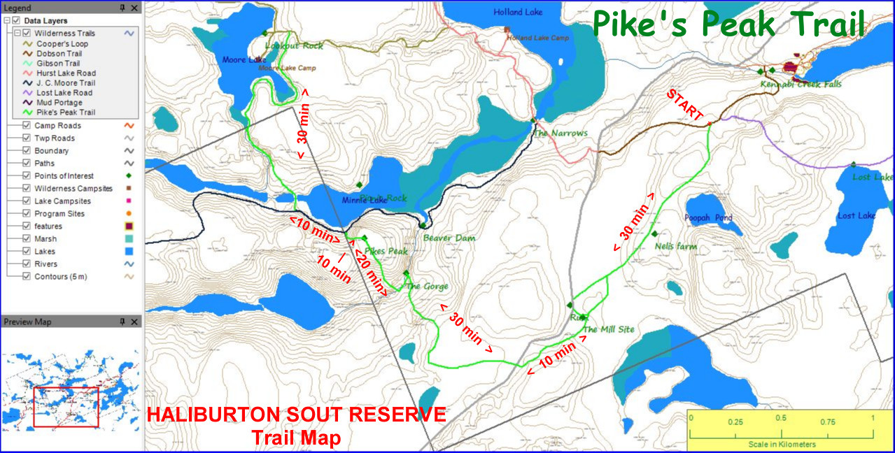 Downhill from here - The trail continues north down the west side of Pikes Peak and at the bottom (on the south shore of Minnie Lake) joins the JC Trail. If you turn right and go east along the JC, you'll shortly end up at the Hurst Lake Road. If you turn left (west) the JC and Pikes Peak trails continue together to the west end of Minnie Lake where they have now become a jeep road. At this point the Pikes Peak trail continues to the right and passes north across the end of Minnie Lake. Follow the jeep road until the trail markers show where the trail heads back into the woods on the right. The trail eventually passes above a narrow arm of Moore Lake and then joins the Cooper's Loop Trail just east of Moore Lake.